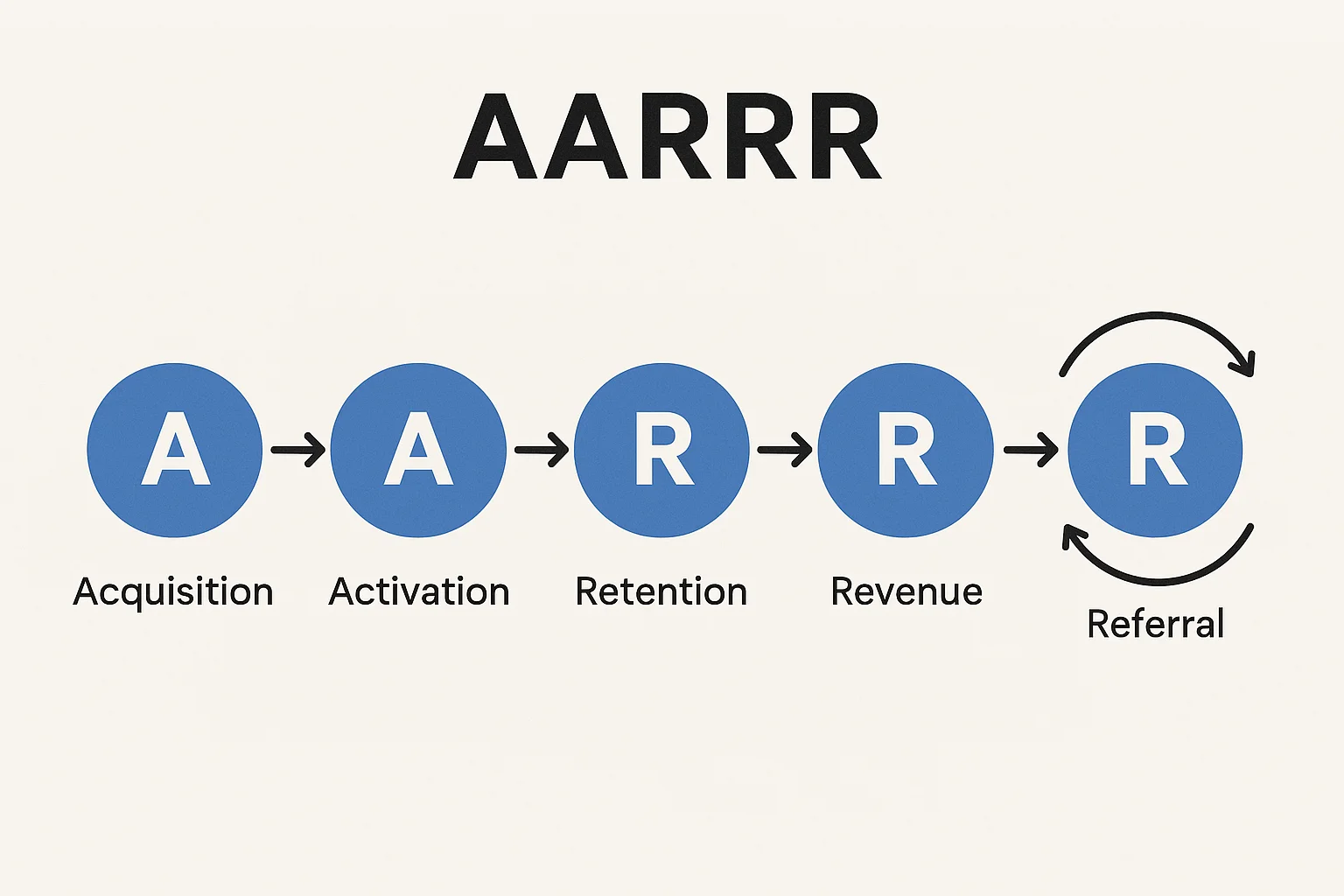 고객이 제품을 처음 인지하고 구매하여 재구매까지 이어지는 여정을 설계하는 것입니다. 흔히 그로스해킹 방법론 중 하나인 ‘AARRR 퍼널 구조화’입니다.