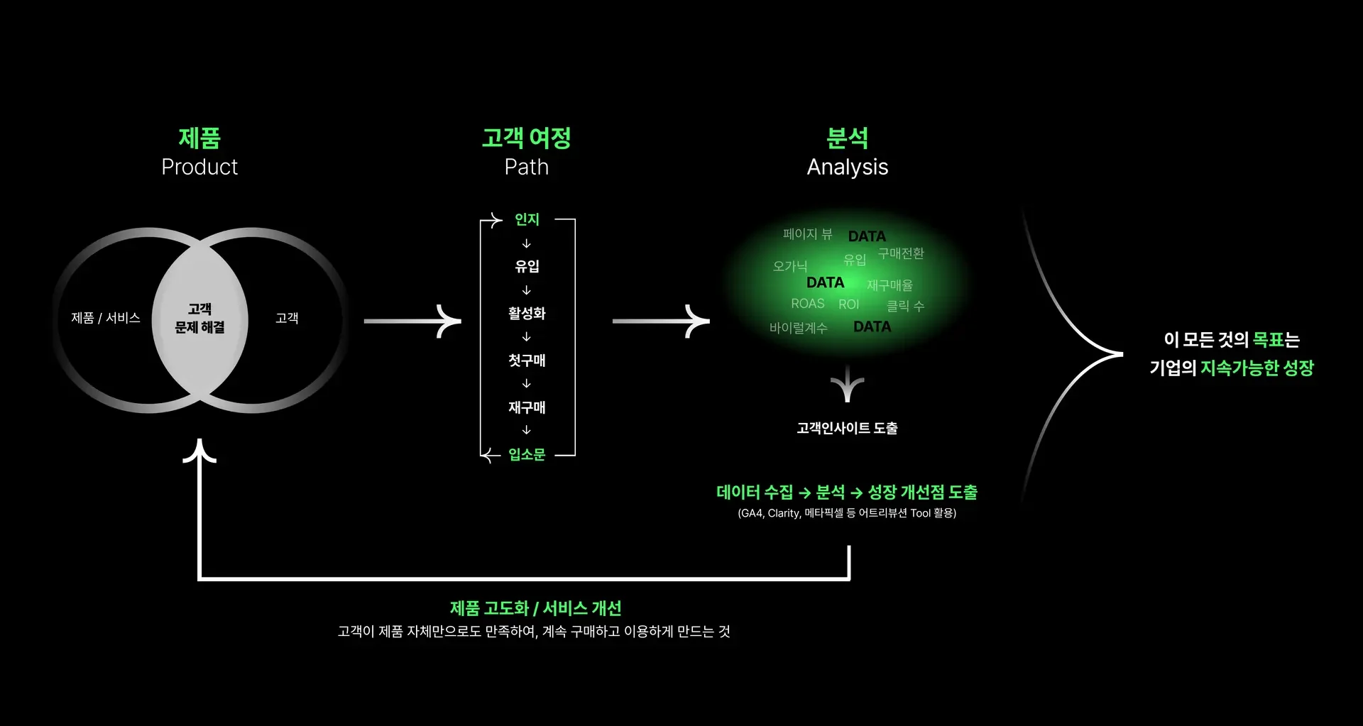 고객의 행동 데이터를 분석하여 근거있는 의사결정을 하는 것입니다. 고객의 행동과 관련된 모든 데이터를 수집하고, Google Analytics, Clarity, MetaPicxel 등의 분석 도구를 사용하여 이를 분석합니다. 데이터 분석을 통해 고객의 행동 패턴을 파악하고, 성장개선점을 도출합니다.